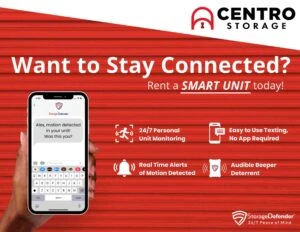 At Centro Self Storage, we pride ourselves on providing a best-in-class experience to our tenants. We know storing can be a stressful experience, so to give you extra peace of mind we’ve partnered with StorageDefender to provide you with Smart Units.